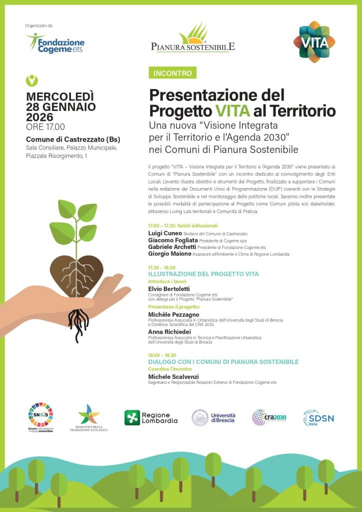 Nell’ambito del percorso triennale del Progetto Pianura Sostenibile, Fondazione Cogeme ets è lieta di invitare sindaci, amministratori, tecnici comunali e stakeholder del territorio all’incontro di presentazione del Progetto VITA – Visione Integrata per il Territorio e l’Agenda 2030, in programma mercoledì 28 gennaio 2026, alle ore 17:00, presso la Sala Consiliare del Comune di Castrezzato.